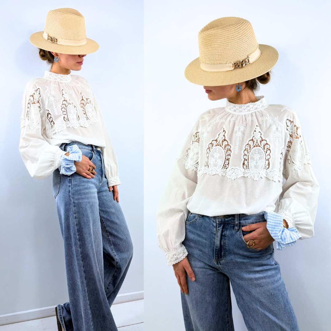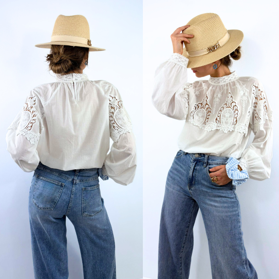La blouse Eliadora est une pièce délicate et romantique qui séduit par son élégance intemporelle. Confectionnée dans un tissu blanc léger et légèrement vaporeux, elle se distingue par son magnifique plastron en dentelle finement travaillé qui orne le haut du buste et apporte relief et raffinement. Son col montant bordé de dentelle souligne la finesse de la silhouette tandis que les manches longues légèrement bouffantes, terminées par des poignets délicatement travaillés, ajoutent une touche bohème et féminine. La transparence subtile de la dentelle contraste avec la douceur du tissu, créant un équilibre parfait entre sophistication et légèreté. Facile à associer avec un jean ou une pièce plus habillée, la blouse Eliadora incarne un charme romantique et lumineux, idéal pour sublimer une tenue avec élégance.