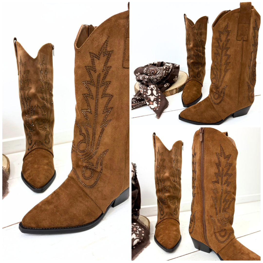 Les bottes Arizona sont des bottes d’inspiration western en suédine marron chaud, dotées d’une tige mi-mollet élégamment structurée, d’un bout légèrement pointu et d’un talon biseauté confortable qui élance la silhouette ; leurs motifs végétaux finement dessinés et rehaussés de petits strass ton sur ton apportent une touche lumineuse et raffinée, tandis que la fermeture zippée latérale assure un enfilage facile et un maintien optimal, faisant de ce modèle une pièce de caractère à la fois bohème, chic et facile à porter au quotidien.