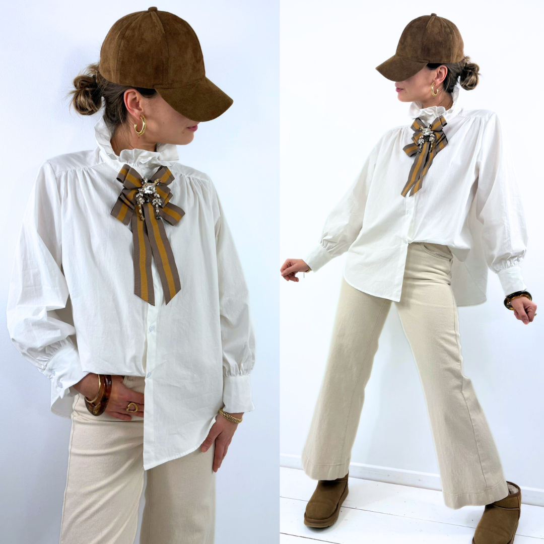 Porté seul, le chemisier Clarisse est intemporel et chic. Pour plus de charme, on peut y ajouter une broche comme sur la photo : un nœud rayé aux tons bruns et dorés, orné d’un bijou central scintillant. Ce détail transforme instantanément la pièce en une tenue plus habillée et précieuse, parfaite pour une occasion spéciale ou pour donner du relief à un look du quotidien.