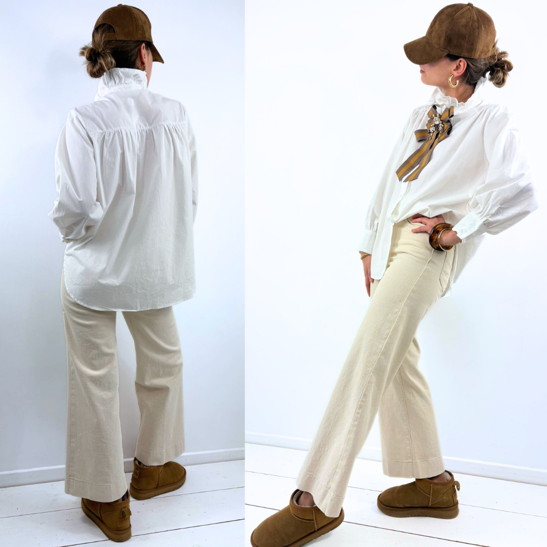 Confectionné dans une matière légère et fluide, il se distingue par son blanc lumineux et sa coupe délicatement ample. Le col montant légèrement volanté apporte une touche romantique et raffinée, tandis que les fronces discrètes au niveau des épaules et les manches légèrement bouffantes structurent la silhouette avec douceur. Les poignets larges ajoutent du caractère et renforcent son allure sophistiquée.