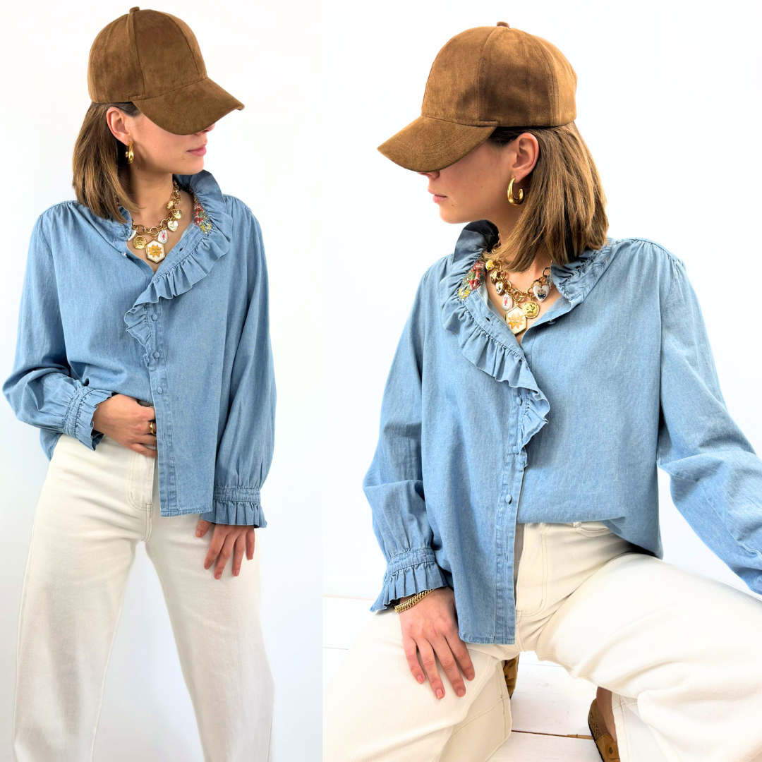 Le chemisier Garance charme par son allure à la fois romantique et moderne, confectionné dans une matière fluide au bleu doux effet denim qui apporte une élégance naturelle ; sa coupe légèrement ample assure un tombé léger et confortable, tandis que son encolure ornée de volants asymétriques structure délicatement le haut et attire le regard ; les manches longues subtilement bouffantes, resserrées aux poignets avec de jolis détails froncés, renforcent son esprit féminin ; facile à porter au quotidien comme en version plus habillée, Garance est une pièce raffinée au caractère doux et affirmé.