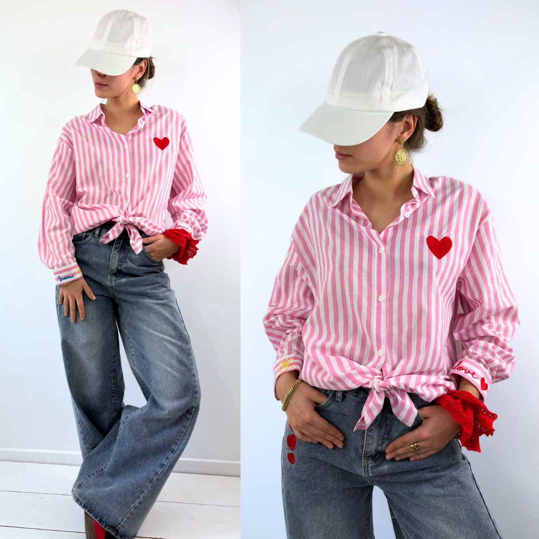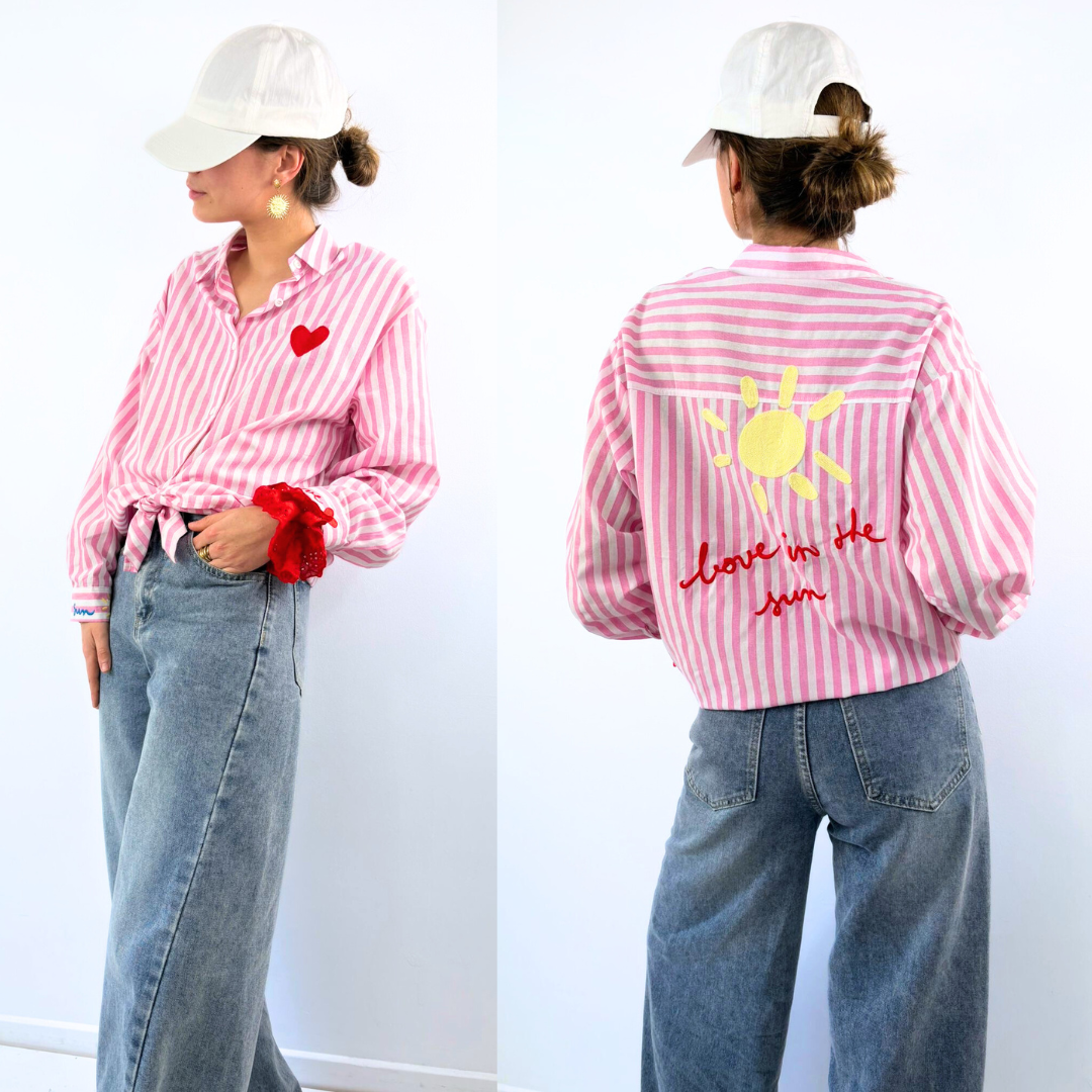 À l’avant, un petit cœur rouge brodé sur la poitrine ajoute une note tendre et délicate. Dans le dos, un soleil jaune accompagné de l’inscription « love in the sun » en broderie rouge insuffle une ambiance estivale et joyeuse. Le chemisier Lison est ainsi une pièce pétillante et originale, idéale pour illuminer une tenue simple avec une touche romantique et solaire.