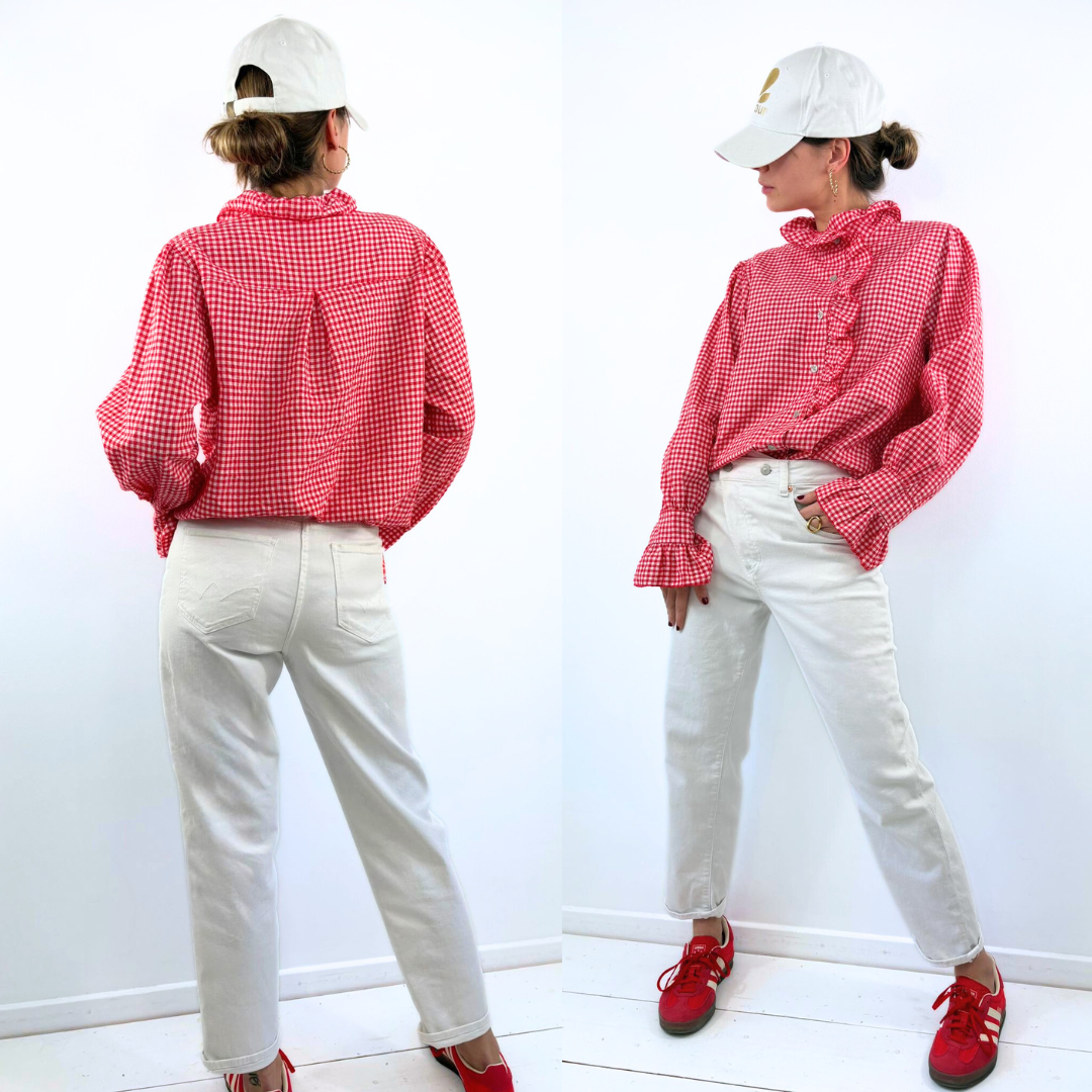 Le chemisier Rosalie séduit par son imprimé vichy rouge et blanc, à la fois intemporel et plein de fraîcheur, qui évoque un esprit rétro revisité avec modernité. Sa coupe légèrement ample apporte une belle liberté de mouvement, tandis que le col montant délicatement volanté et la rangée de froufrous asymétriques le long de la patte de boutonnage ajoutent une touche féminine et raffinée. Les manches longues, subtilement bouffantes avec poignets boutonnés, équilibrent l’ensemble pour un rendu chic sans effort. Le chemisier Rosalie est une pièce lumineuse et expressive, idéale pour réveiller un jean clair ou un pantalon blanc avec caractère et élégance.
