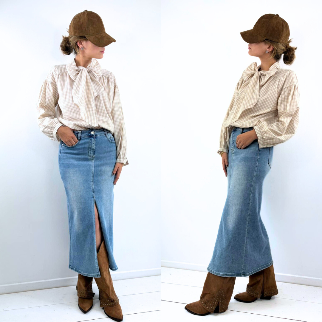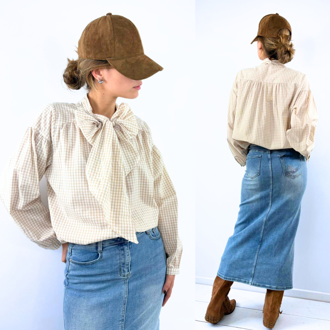 Le chemisier Sarah incarne l’élégance romantique avec une touche rétro. Confectionné dans un tissu à carreaux vichy beige et blanc, il séduit par sa coupe fluide et son large nœud lavallière à l’encolure, qui apporte une note sophistiquée et féminine. Ses manches longues légèrement bouffantes avec poignets boutonnés ajoutent du volume tout en légèreté. Facile à associer, ce chemisier est parfait aussi bien rentré dans une jupe en jean pour une silhouette casual chic, que porté avec un pantalon habillé pour un look plus raffiné. Un essentiel revisité avec charme et douceur.
