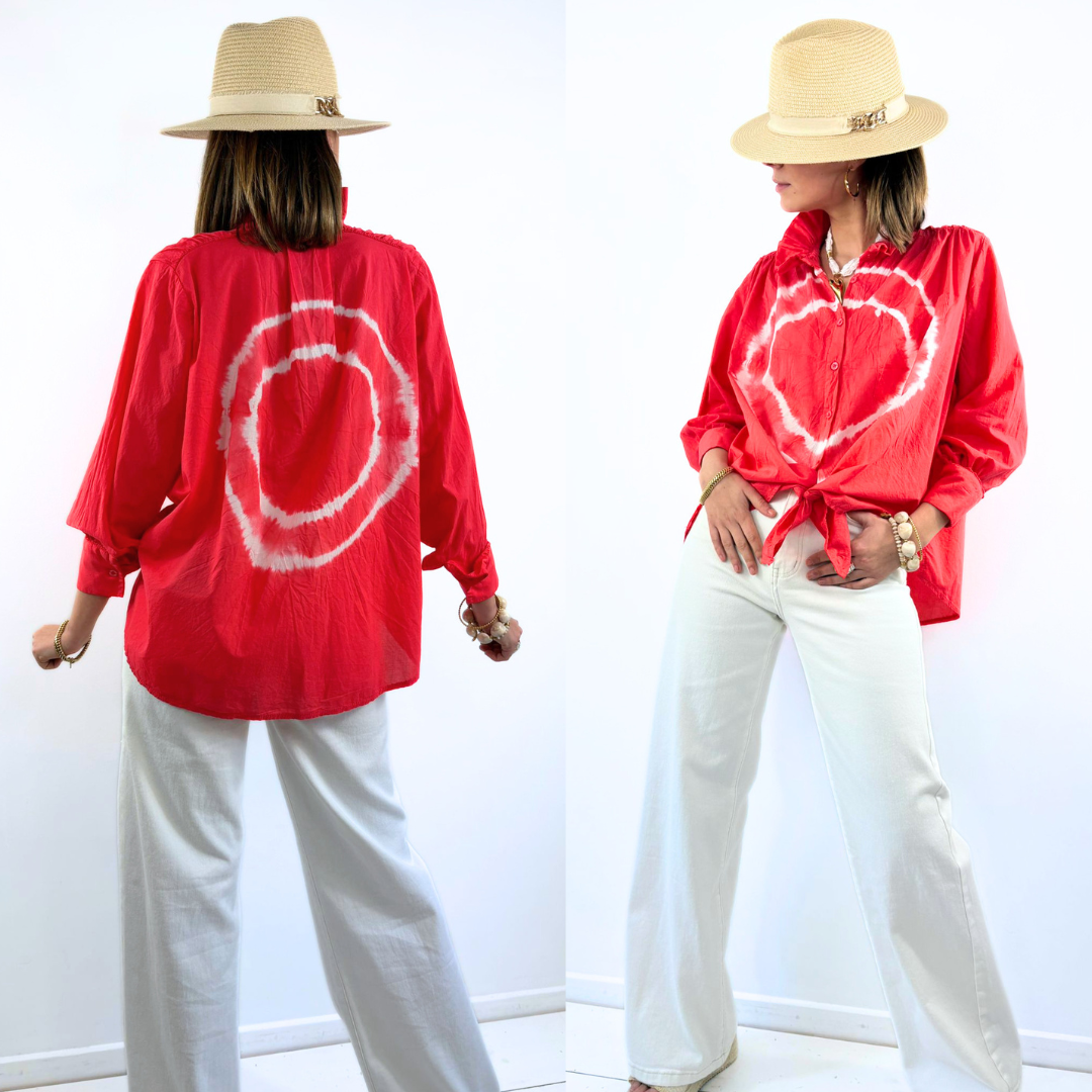 Le chemisier Soleya attire immédiatement le regard avec son rouge éclatant rehaussé d’un motif tie & dye, à la fois audacieux et plein de douceur ; confectionné dans une matière légère et fluide, il offre une coupe ample qui assure confort et liberté de mouvement, sublimée par des manches longues légèrement bouffantes et des poignets délicatement structurés ; son col souple et sa patte de boutonnage lui donnent une allure casual chic, tandis que le lien à nouer sur le devant permet de le porter de façon plus ajustée et féminine ; Soleya est une pièce forte et lumineuse, idéale pour apporter une touche de caractère et de bonne humeur à une tenue.