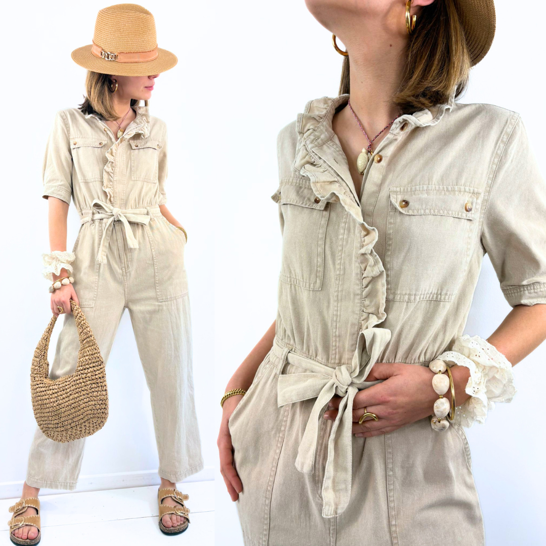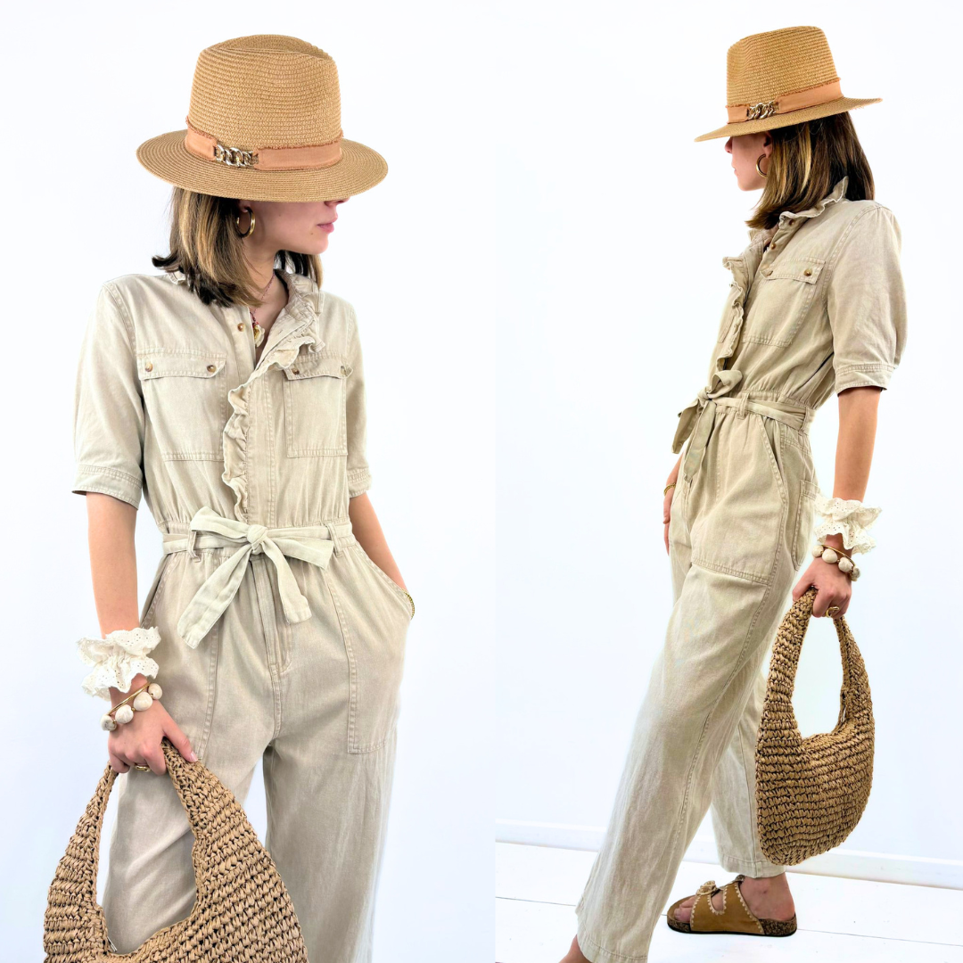 La combinaison Ubud incarne un esprit naturel et effortless, entre élégance décontractée et inspiration safari chic. Réalisée dans une toile souple au toucher légèrement texturé, elle séduit par sa teinte beige douce, facile à porter en toute saison.
