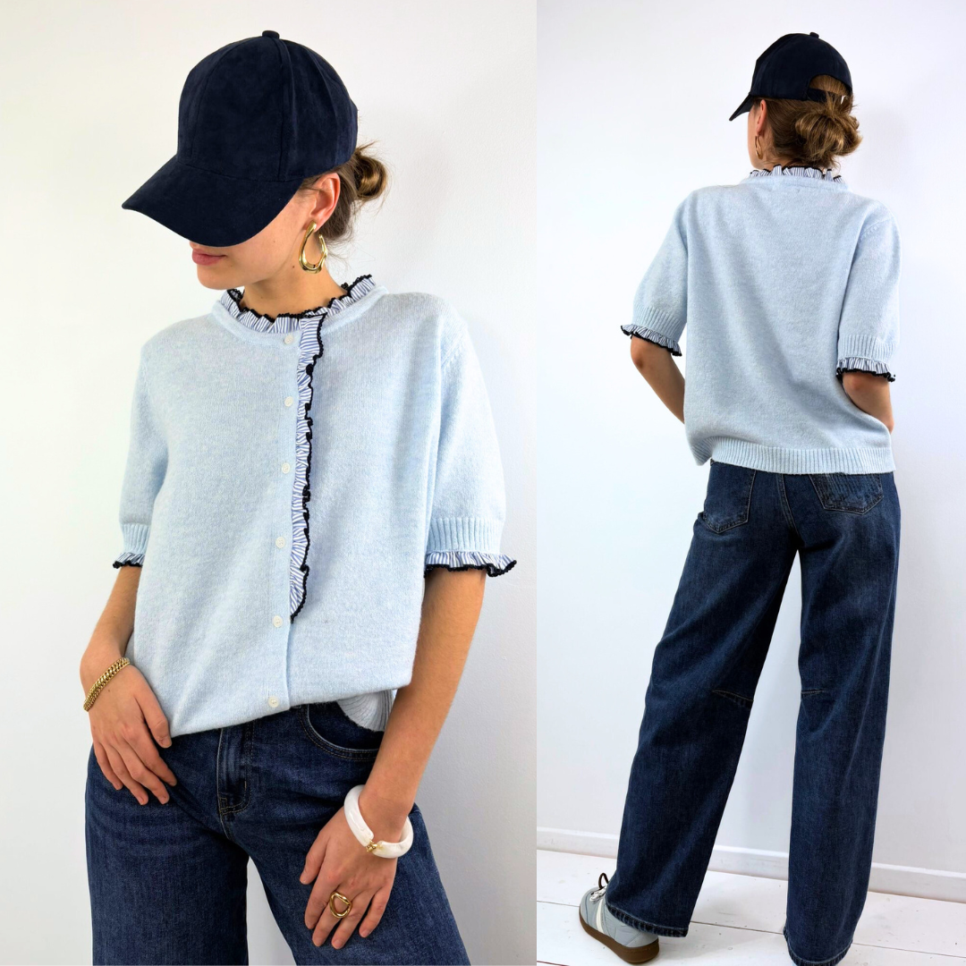 Le gilet Azélie est une pièce délicate et raffinée qui mêle douceur et féminité avec subtilité. Confectionné dans une maille fine bleu ciel, il séduit par sa coupe droite légèrement ample et ses manches courtes structurées par un bord-côte discret. Son encolure ronde et sa boutonnière ton sur ton sont sublimées par un délicat volant rayé bleu et blanc rehaussé d’un liseré contrastant foncé, présent également aux extrémités des manches, apportant une touche couture pleine de charme. À la fois sage et sophistiqué, le gilet Azélie se porte aussi bien fermé comme un petit pull que légèrement ouvert sur un top, et s’associe parfaitement à un jean pour une silhouette chic et moderne au quotidien.