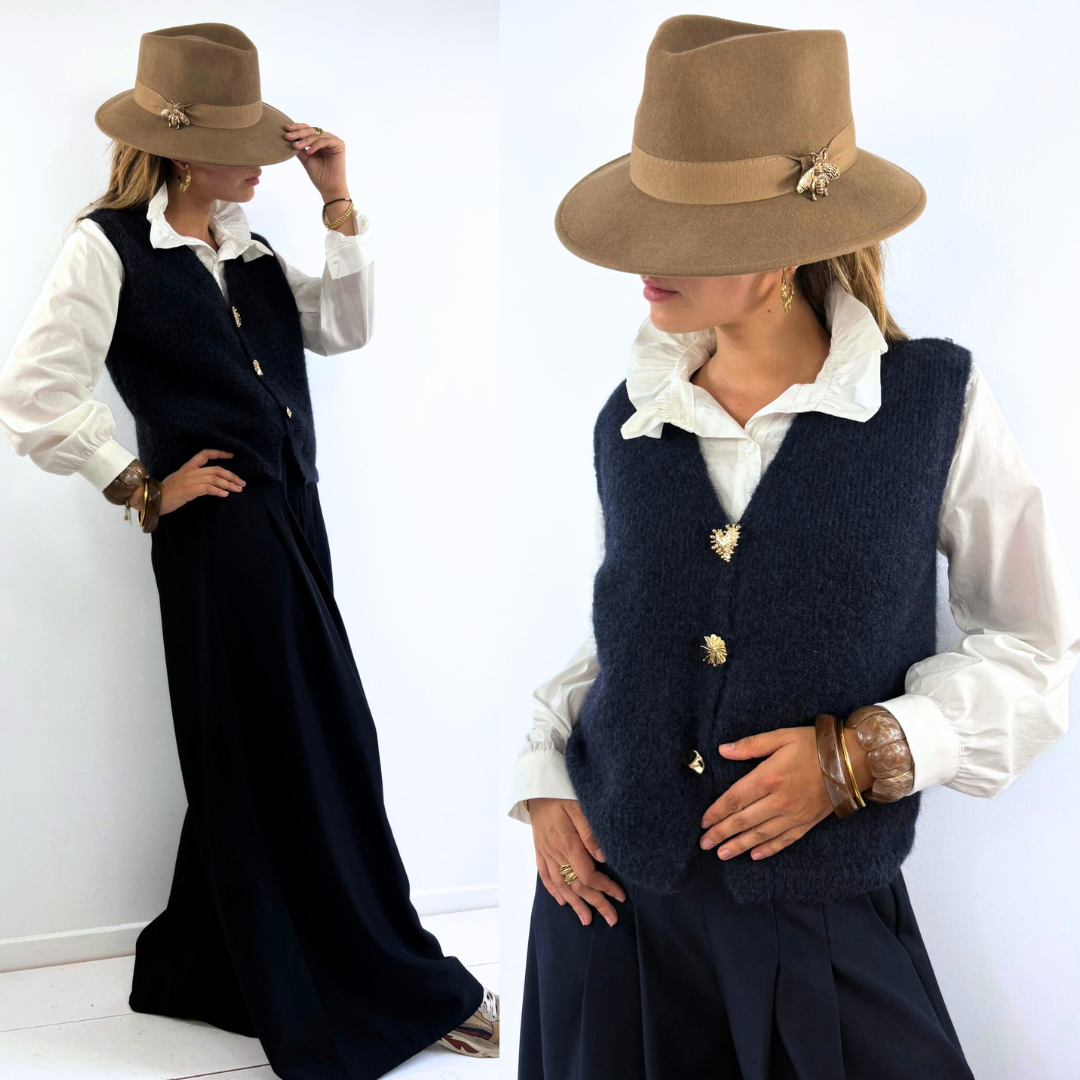 Le gilet Chloé est un modèle sans manches, élégant et polyvalent, conçu dans une matière douce et confortable. Sa coupe droite et légèrement ample permet de le superposer facilement sur une chemise, une blouse ou même une robe, pour créer des looks casual chic ou plus habillés. Idéal pour la mi-saison, il se porte aussi bien ouvert que fermé et apporte une touche de style intemporel à toutes vos tenues.