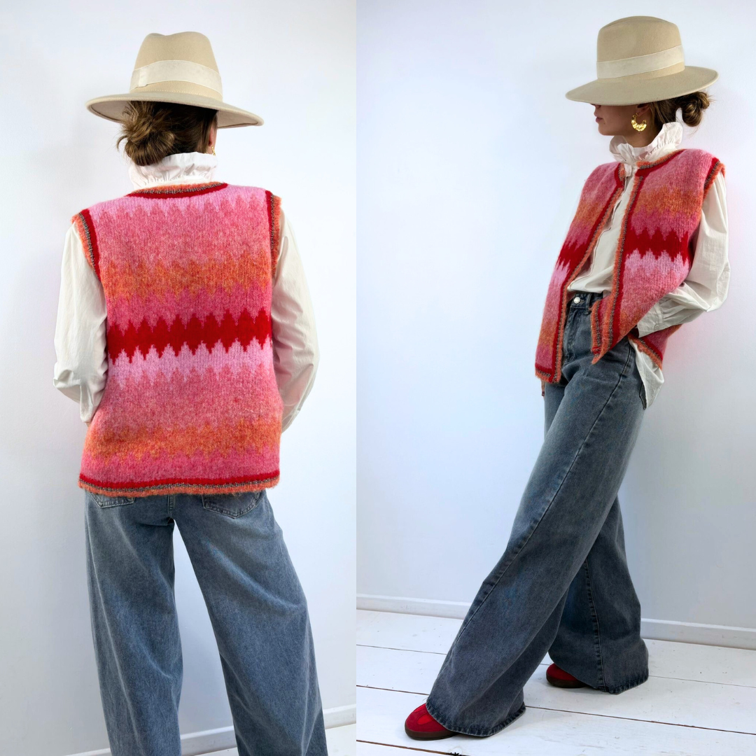 Le gilet sans manches Tbilissi est une pièce pleine de caractère, tricotée dans une maille douce et légèrement duveteuse, mêlant des nuances vibrantes de rose, rouge et touches orangées dans un motif graphique presque artisanal qui lui donne une vraie singularité. Ouvert sur le devant, il est souligné de finitions contrastées qui structurent la silhouette tout en laissant apparaître la blouse en dessous, et son encolure arrondie renforce son allure rétro-chic. Porté sur une chemise blanche à col volanté ou même à même la peau à la mi-saison, il apporte immédiatement une note chaleureuse, bohème et un brin audacieuse à une tenue, entre esprit folk et élégance contemporaine.