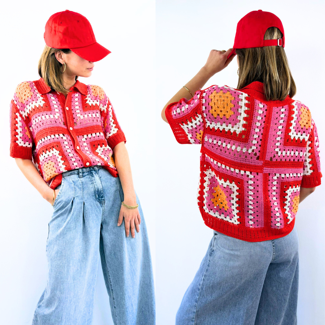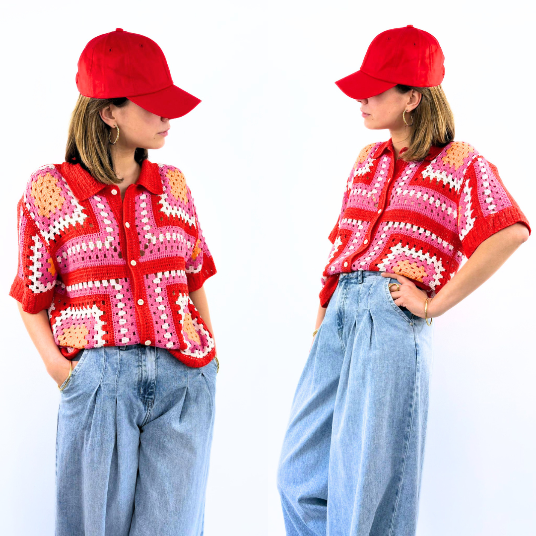 Le gilet Valparaíso célèbre un esprit rétro vibrant et plein de caractère. Entièrement réalisé en crochet, il se distingue par son assemblage de carrés graphiques aux teintes éclatantes — rouge, rose, écru et touches d’orange — qui créent un patchwork à la fois chaleureux et audacieux.