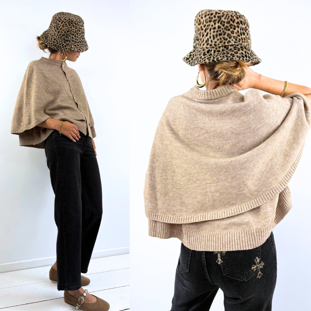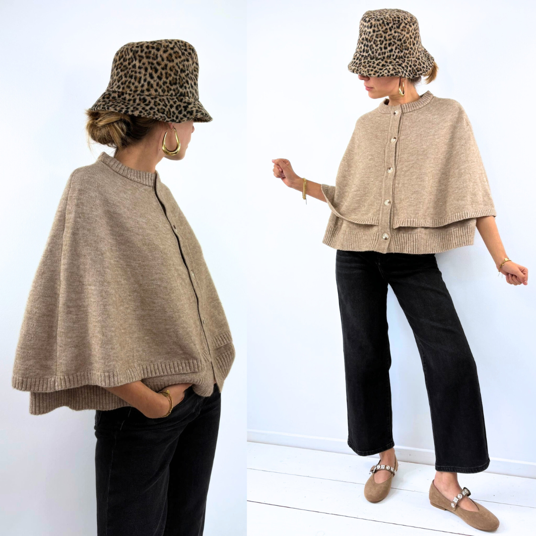 Le gilet Vénus adopte une silhouette cape ultra-tendance, dans une maille douce et chaude. Sa forme ample, ses manches courtes et son boutonnage à l’avant lui donnent un esprit à la fois bohème et contemporain. La superposition de ses pans crée un joli volume structuré, tandis que sa teinte beige neutre le rend facile à assortir. Idéal à porter sur un col roulé fin ou une chemise pour affronter les premières fraîcheurs avec style.