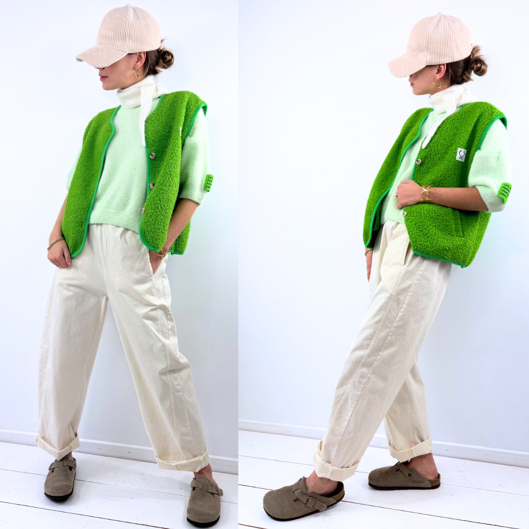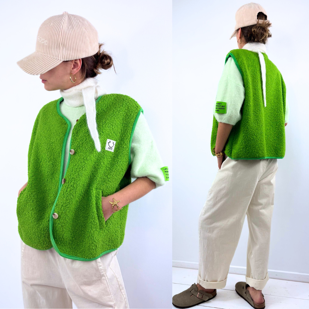 Le gilet Zéphyria est une pièce sans manches au caractère audacieux et plein de fraîcheur, confectionnée dans une matière effet moutonné ultra douce d’un vert éclatant qui illumine instantanément une tenue. Sa coupe droite légèrement ample assure un tombé confortable et moderne, tandis que les finitions passepoilées ton sur ton structurent délicatement la silhouette. Fermé par de jolis boutons naturels et doté de poches pratiques, il mêle esprit casual et touche ludique grâce à son petit patch signature sur la poitrine. Facile à superposer sur un pull fin, un sweat ou un col roulé, le gilet Zéphyria apporte une note vitaminée et contemporaine au vestiaire, parfait pour twister un look simple avec originalité.