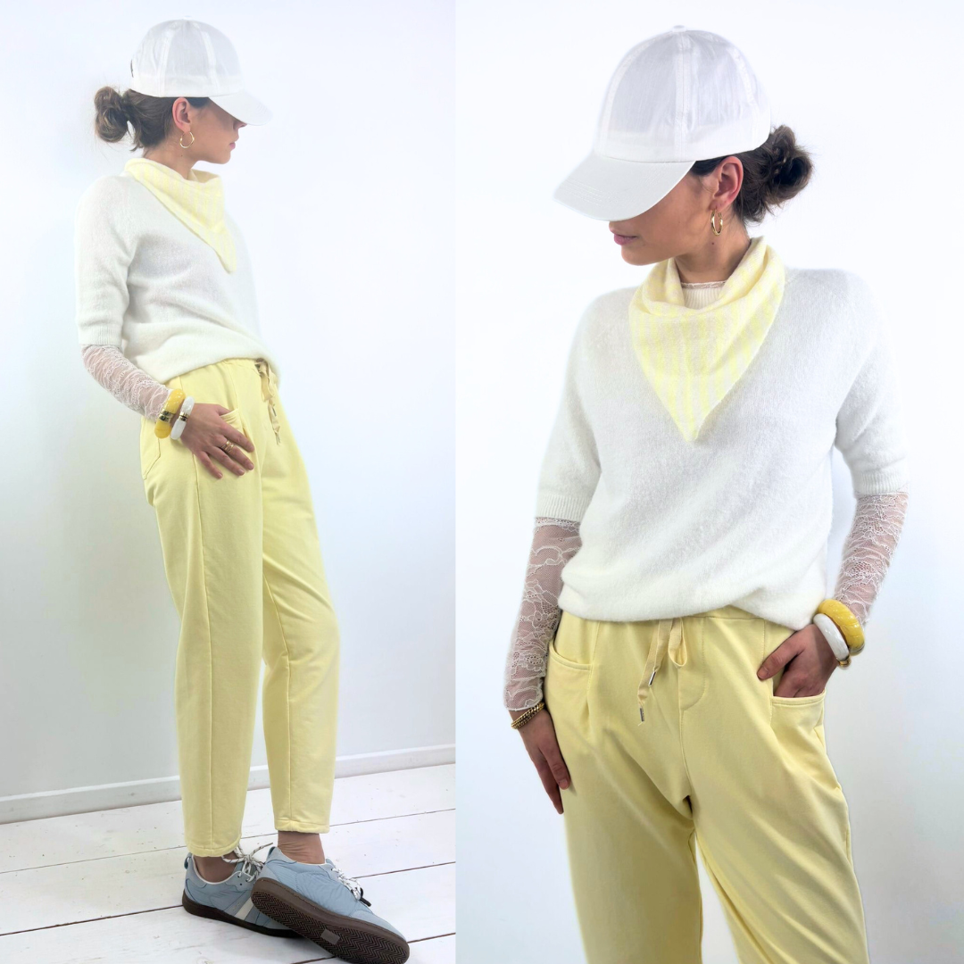 Dans une douce teinte jaune pastel, il illumine la silhouette avec subtilité. Sa matière façon jogging, souple et légèrement extensible, offre une sensation de confort immédiat tout en conservant une ligne structurée. La taille élastiquée avec lien de serrage apporte une touche casual, tandis que la coupe droite légèrement raccourcie affine la jambe et modernise l’ensemble.