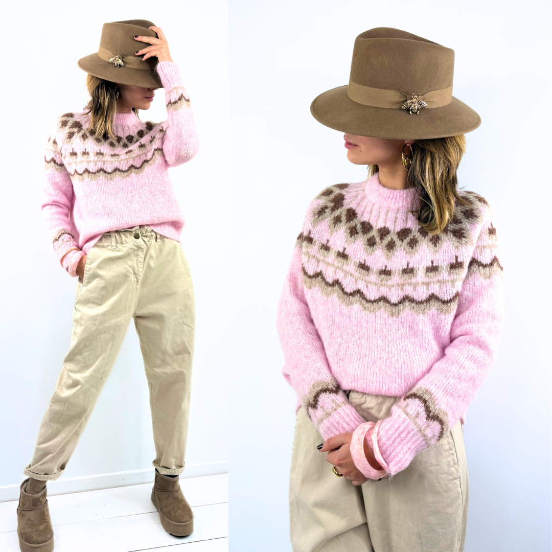 Le pull Aurore est un pull en maille douce et moelleuse, décliné dans un rose poudré lumineux rehaussé de motifs jacquard d’inspiration nordique aux tons beige et marron, qui dessinent élégamment l’encolure et les poignets ; sa coupe légèrement ample et son col montant côtelé offrent un confort enveloppant tout en structurant la silhouette, faisant de cette pièce chaleureuse et raffinée un indispensable de saison, idéal à associer à un pantalon clair pour une allure à la fois douce, féminine et intemporelle.