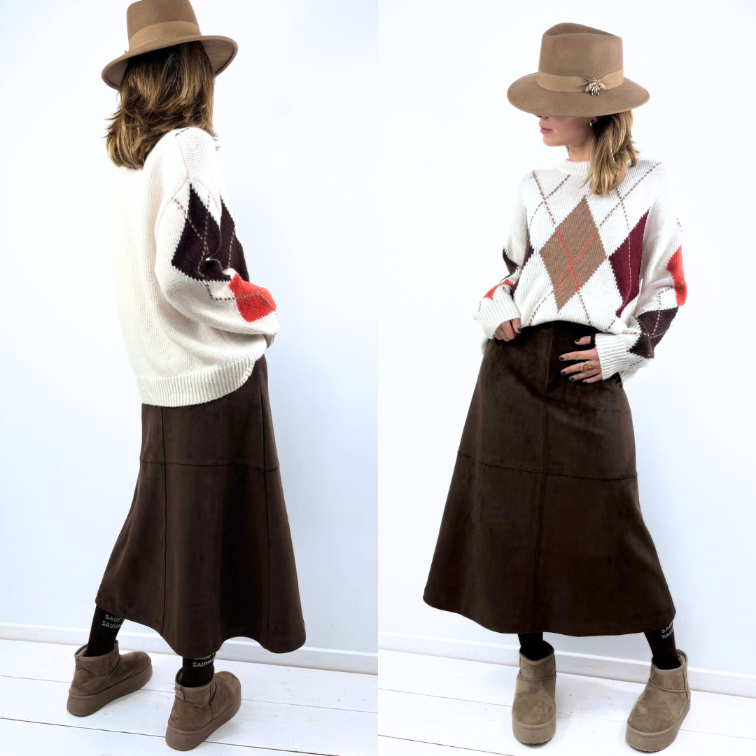 Son fond écru est contrasté par un jeu de losanges brun, chocolat et bordeaux, ponctués de touches terracotta qui apportent profondeur et caractère. Le motif central structure la silhouette tandis que les manches reprennent le dessin de façon plus libre, créant un équilibre visuel très contemporain.