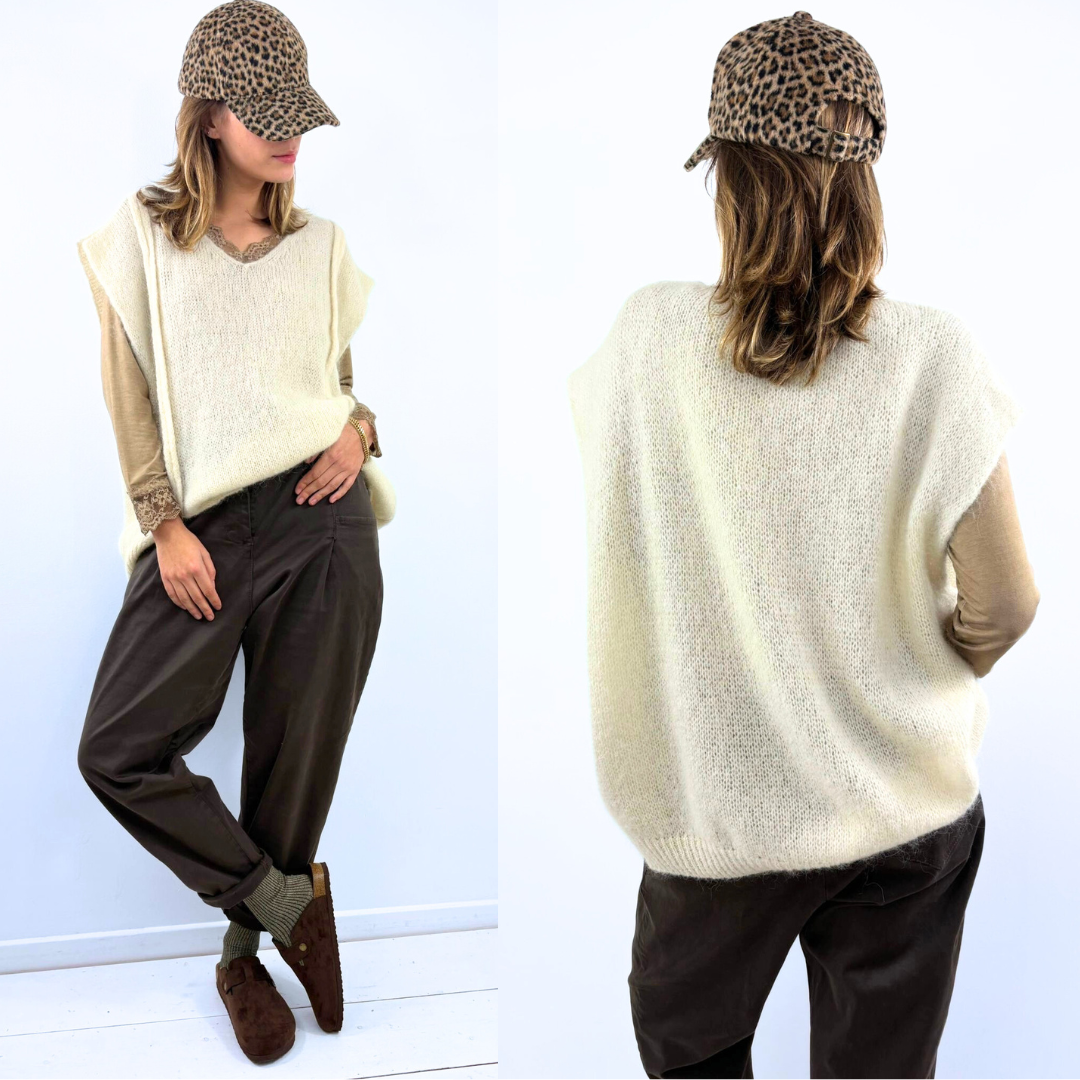 Le pull Leewane séduit par sa simplicité élégante et son esprit cocooning. Confectionné dans une maille douce couleur beige écru, il se distingue par sa coupe ample et sans manches, idéale pour jouer sur les superpositions. Son col V délicat et ses fentes latérales apportent une touche de légèreté à la silhouette, tout en offrant un tombé fluide et moderne. On aime le porter sur un sous-pull en dentelle ou une chemise pour un look féminin et raffiné, ou simplement avec un t-shirt pour un style plus casual. Un indispensable du dressing automne-hiver, aussi confortable qu’intemporel.