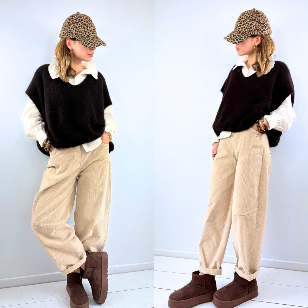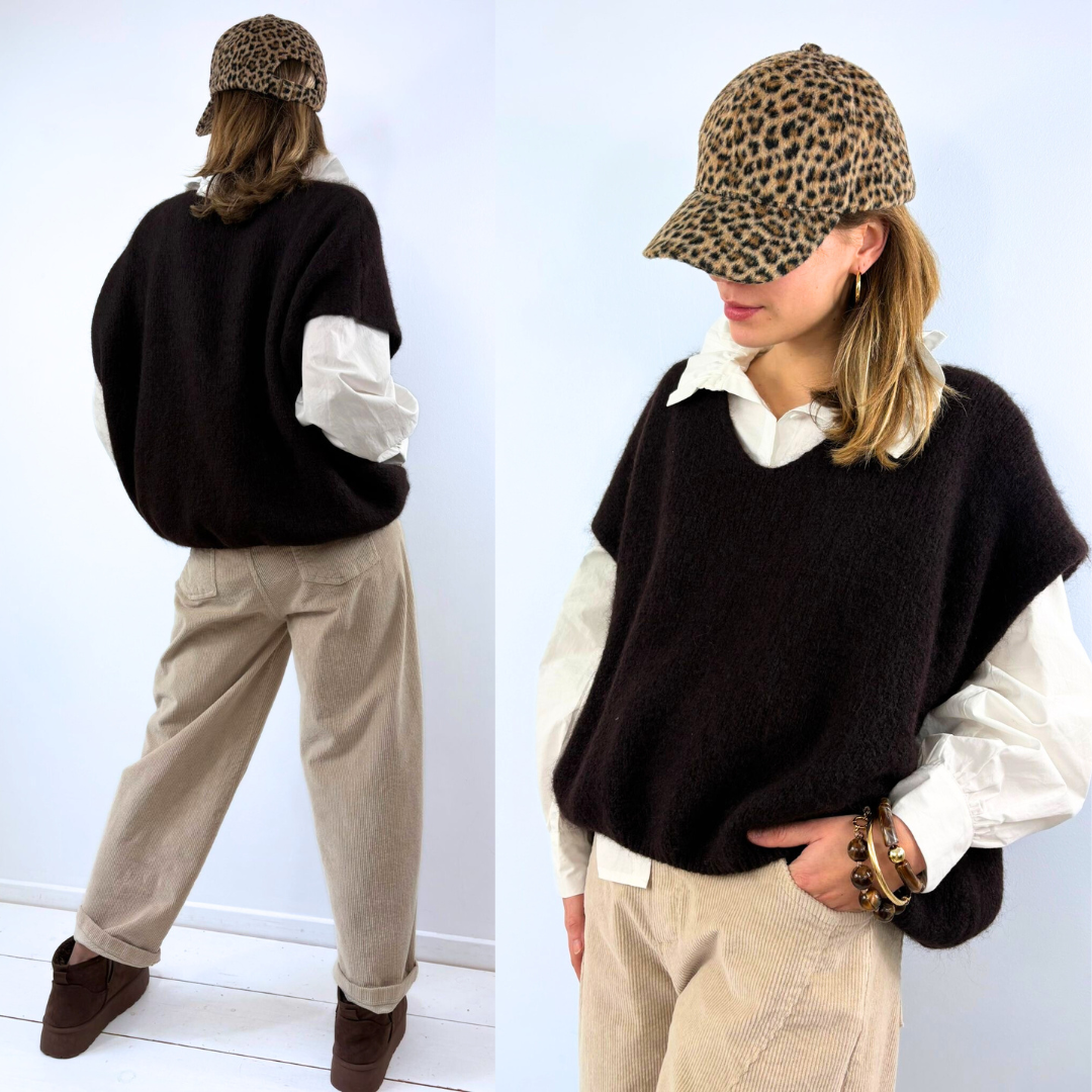Ce pull sans manches marron foncé séduit par son allure cosy et élégante, avec une maille douce et légèrement duveteuse qui apporte immédiatement de la chaleur au look. Sa coupe ample et fluide permet de le superposer facilement sur une chemise ou un top, laissant apparaître les manches pour jouer sur les contrastes et les volumes. L’encolure en V, subtilement dessinée, allonge la silhouette tandis que la teinte chocolat profond apporte une touche naturelle et raffinée, facile à associer avec un jean, un pantalon en velours ou une jupe. C’est une pièce idéale pour composer des tenues de saison à la fois confortables et stylées.