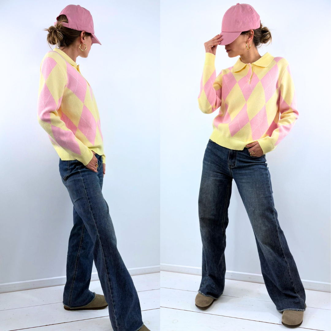 Ce pull joue la carte de la fraîcheur et du rétro avec beaucoup de douceur. Confectionné dans une maille fine et agréable, il se distingue par son motif losange façon argyle aux tons pastel rose et jaune, lumineux et délicatement vintage. Son col polo apporte une touche chic-décontractée, tandis que la coupe droite légèrement ajustée le rend facile à porter au quotidien, aussi bien rentré dans un jean que porté loose. Les finitions côtelées aux poignets et à la taille structurent l’ensemble et assurent un joli tombé. Le pull Paloma est une pièce pleine de bonne humeur, idéale pour apporter une note colorée et élégante à une tenue simple.