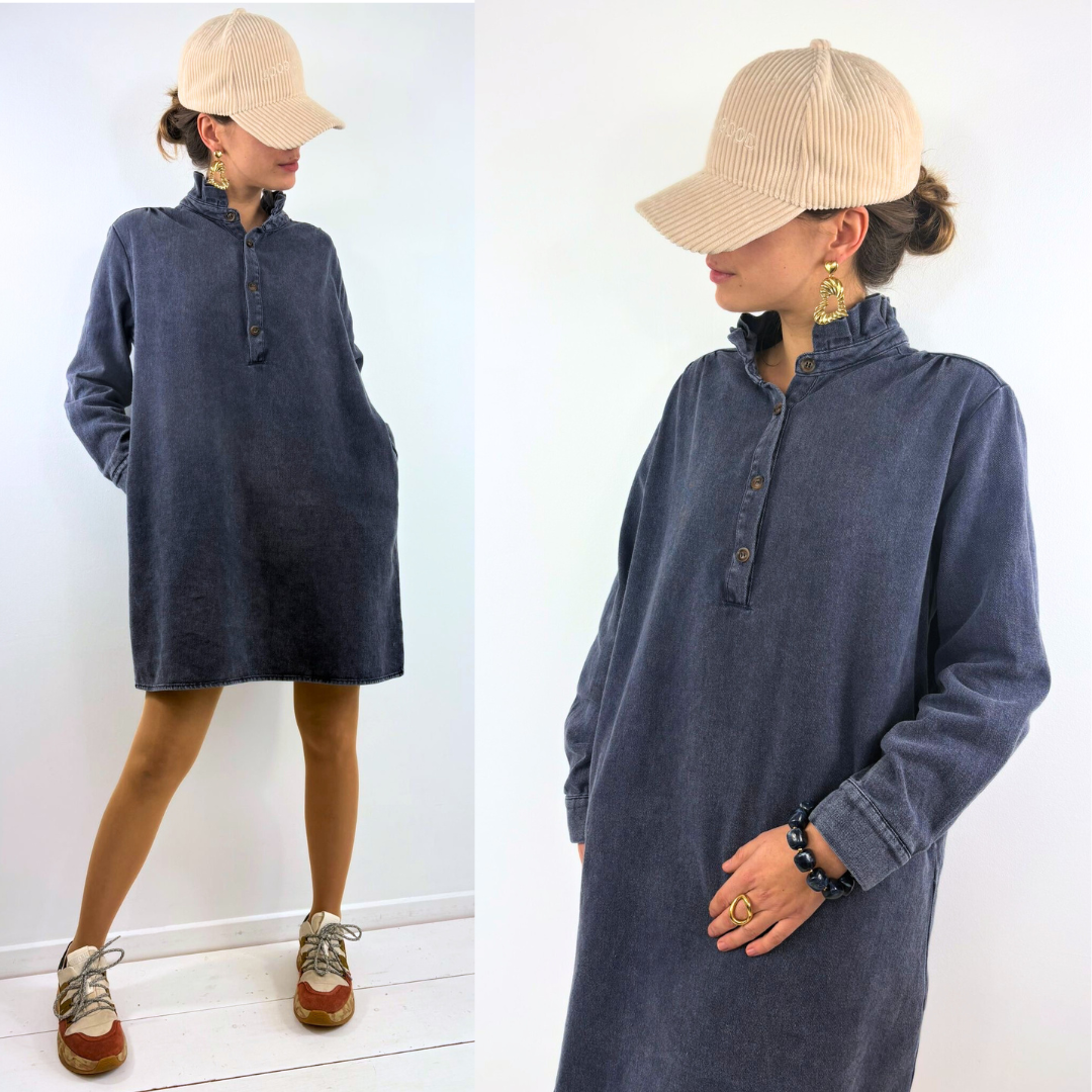 La robe Alma séduit par son allure décontractée et contemporaine, à mi-chemin entre la robe-chemise et la robe casual chic : confectionnée dans un denim souple bleu légèrement délavé, elle présente une coupe droite et ample qui assure un confort absolu tout en restant structurée, avec une longueur au-dessus du genou qui allonge la silhouette ; son col montant subtilement froncé apporte une touche féminine et originale, tandis que la patte de boutonnage courte sur le devant rappelle l’esprit utilitaire et moderne de la pièce, complétée par des manches longues aux poignets simples et une ligne épurée qui permet de la porter aussi bien seule que ceinturée ou accessoirisée selon l’envie.