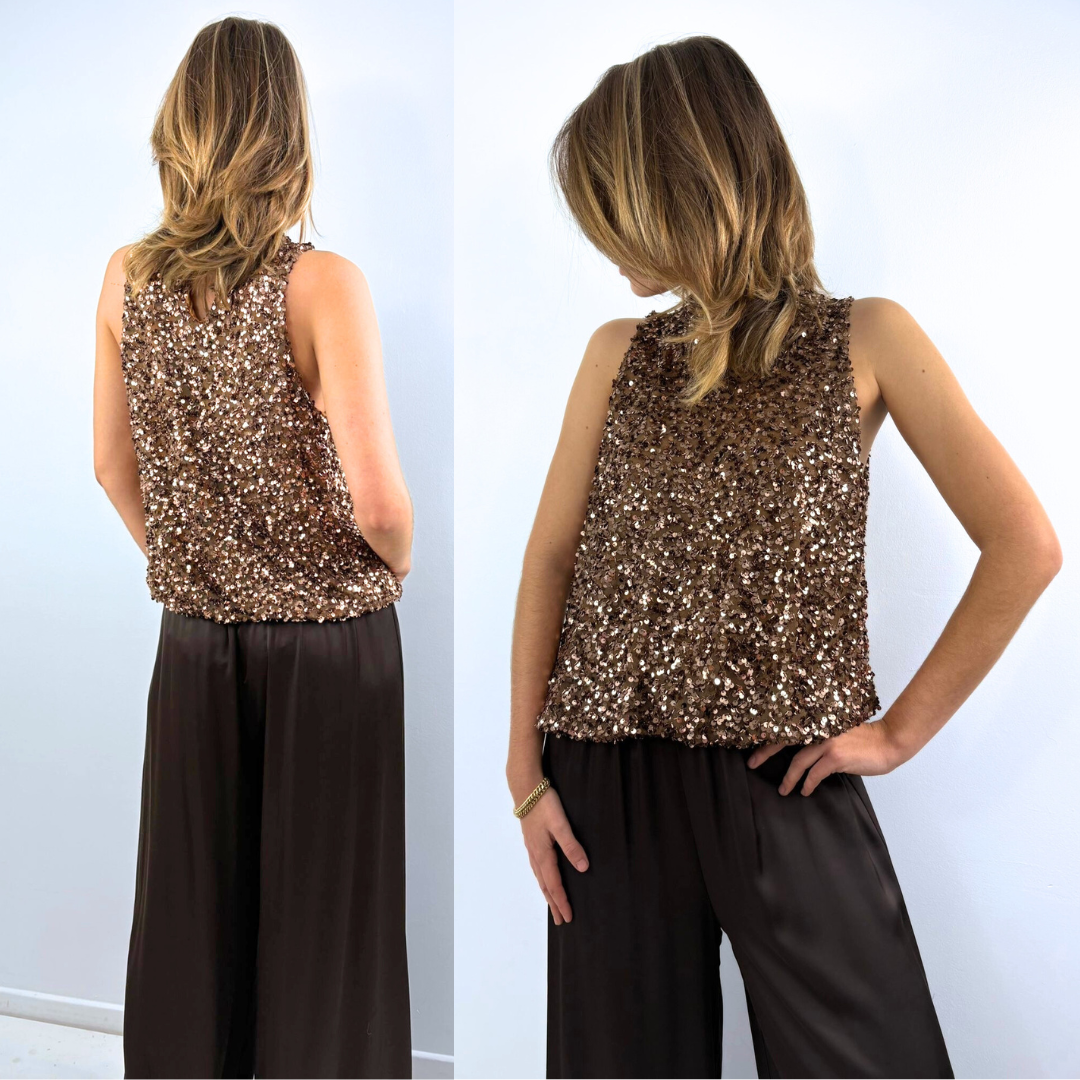 Le top Leane est un débardeur ultra-chic entièrement recouvert de sequins bronze scintillants qui captent magnifiquement la lumière à chaque mouvement. Sans manches et légèrement ample, il offre une coupe droite et élégante, parfaite pour créer un look sophistiqué sans effort. Son tissu souple assure un tombé fluide, tandis que son éclat luxueux en fait une pièce idéale pour les soirées, les fêtes ou toute occasion où l’on souhaite briller avec subtilité. Un top résolument glamour, qui se suffit à lui-même.